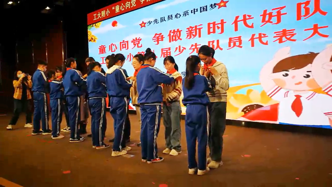 工大附小少工委主任、校长高连宾同志,少工委副主任、德育校长靳凯同志,大队辅导员李慧玲同志,各中队辅导员老师代表以及各少先队员代表出席了此次活动,少先队员代表为领导、中队辅导员佩戴了红领巾。